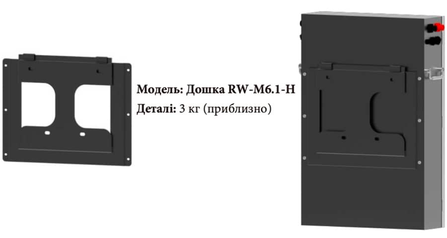 1.Кріпильна дошка для акумулятора RW-M6.1-H є важливим аксесуаром, який входить до комплекту. Спеціально розроблена для зручного настінного встановлення, вона слугує надійною платформою для кріплення приладу. Незалежно від того, для житлового чи комерційного використання, основа RW-M6.1-H спрощує процес встановлення, оптимізуючи використання простору.