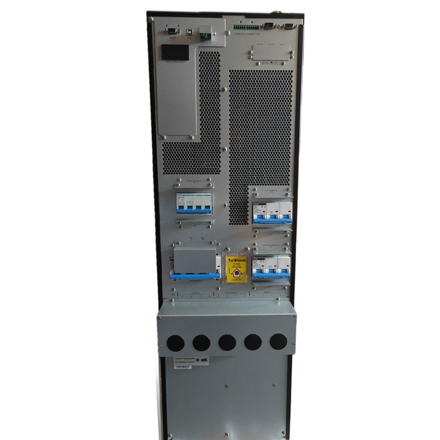 - Інтелектуальне управління. Зручний сенсорний LCD-екран з графічним інтерфейсом надає повну інформацію про роботу ДБЖ, стан батарей, рівень навантаження та інші важливі параметри. Можливість підключення до системи моніторингу (через RS232, USB, SNMP) дозволяє віддалено контролювати стан пристрою.