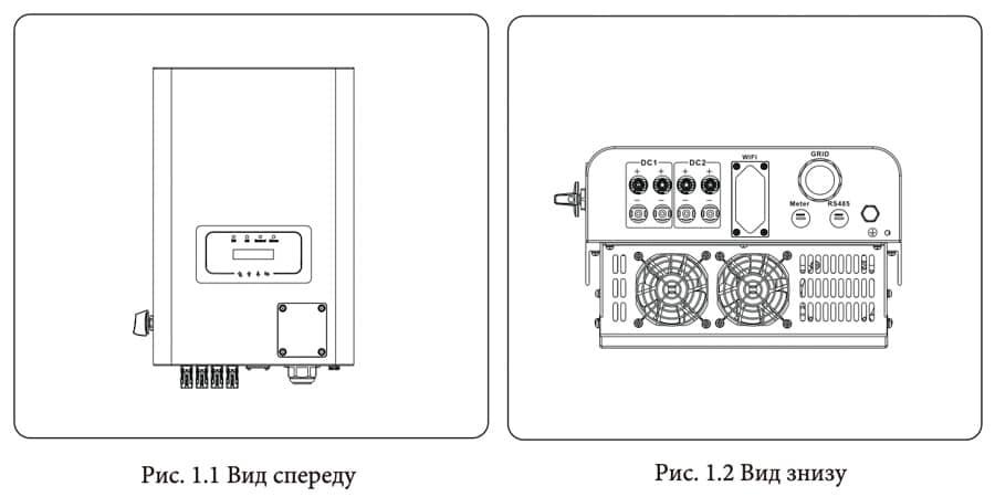 Мережевий інвертор може перетворювати постійний струм сонячної панелі в змінний струм, який можна безпосередньо подавати в мережу. Його зовнішній вигляд показано нижче. Ці фото містять моделі SUN-18K-G05, SUN-20K-G05, SUN-22K-G05, SUN-23K-G05, SUN-25K-G05. Все це разом називається «інвертор».